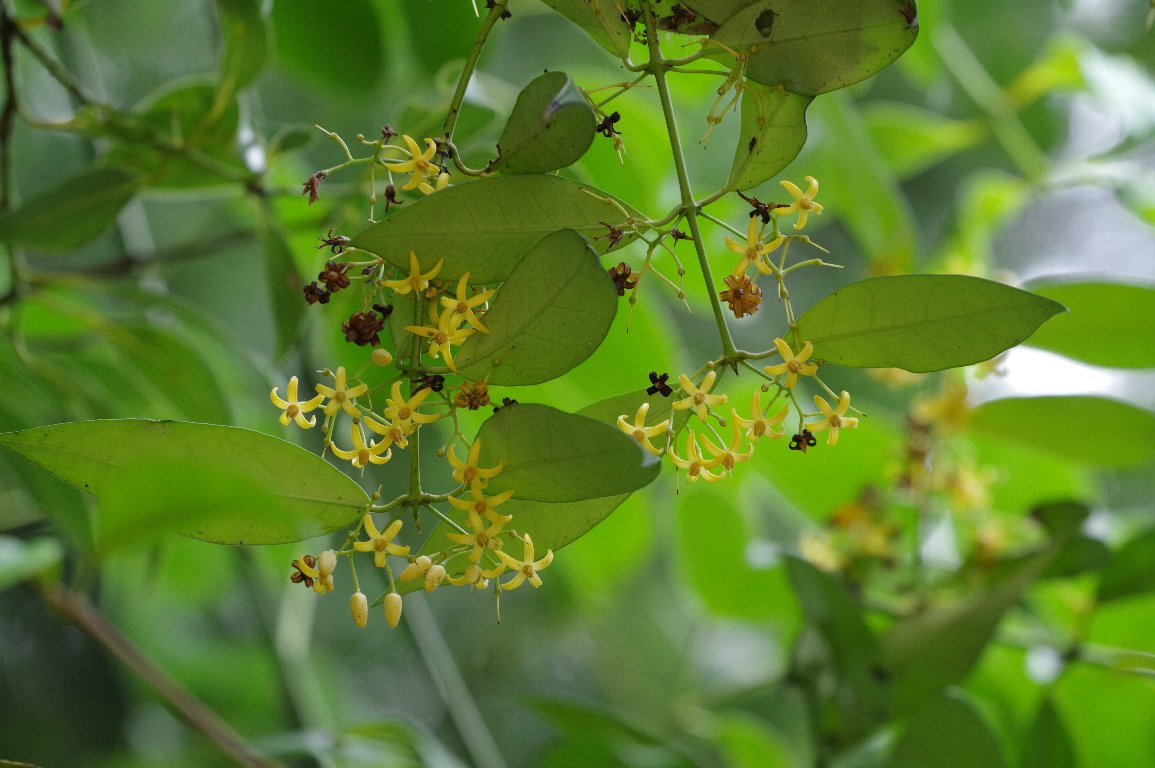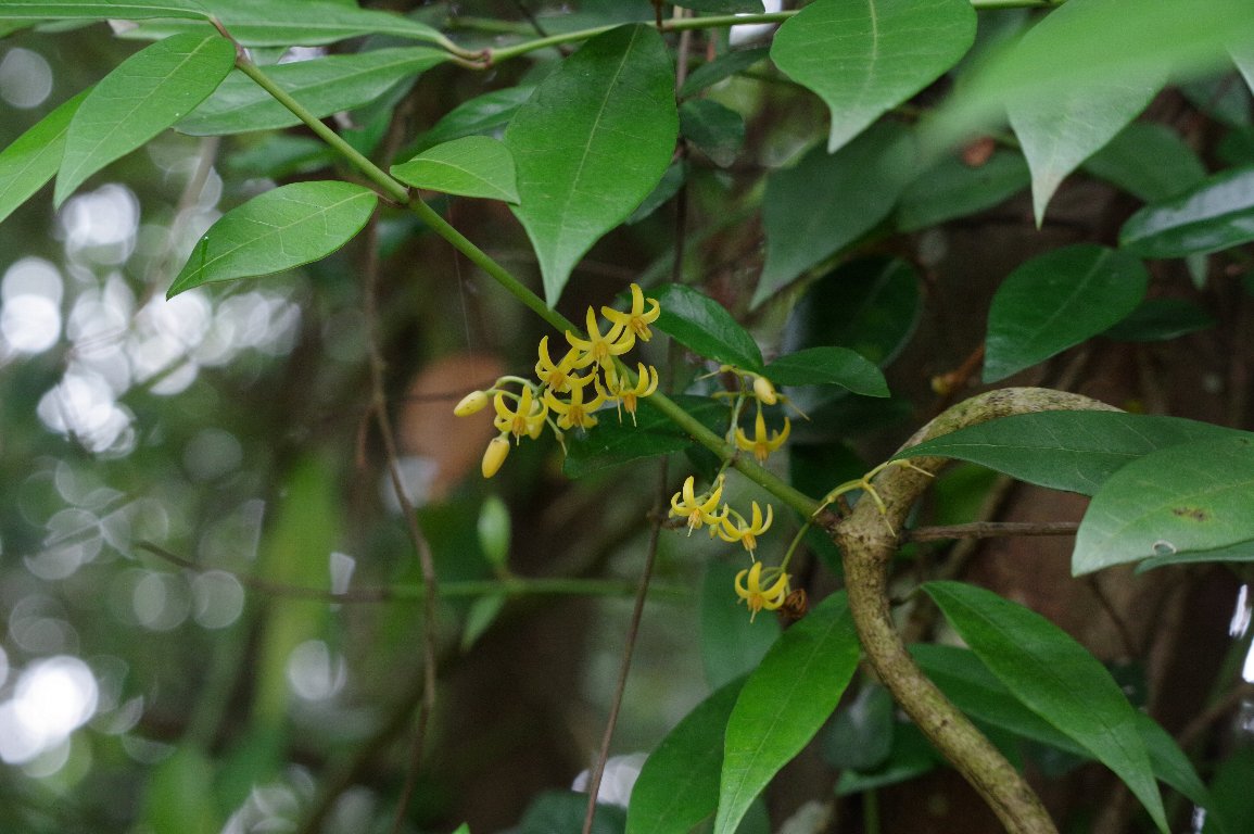 絡みついたつる草の枝先に、小さな黄色い花が幾つも咲いていた。 初めて目にする花、チトセカズラ。 思っていた以上に可愛らしい姿に、ひと目で好きになった。 |