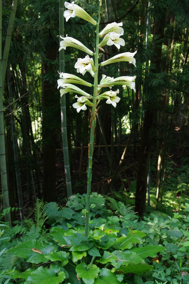林道の道端に、大きなウバユリが咲いていた。 人の背丈ほどに伸びて、豪華に、13輪もの花を咲かせていた。 地味なウバユリも、これだけ立派だと、華がある。 |