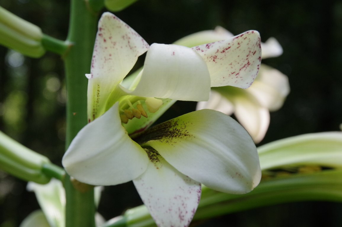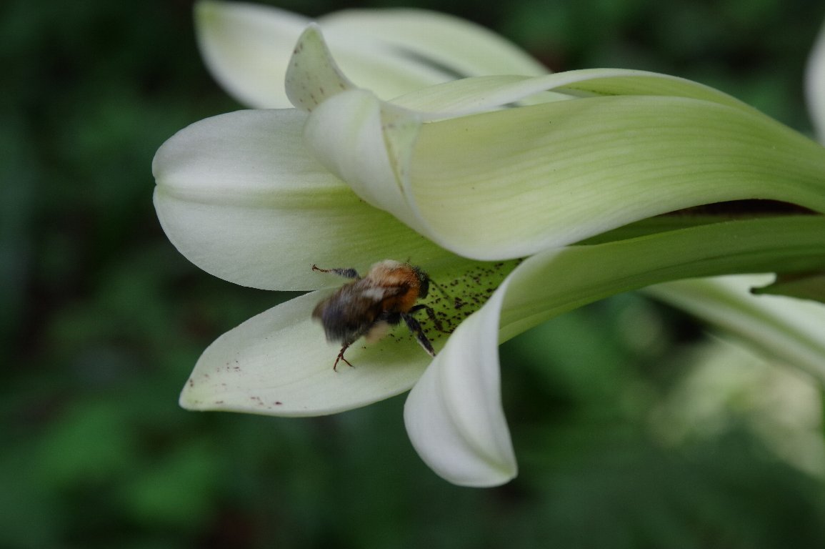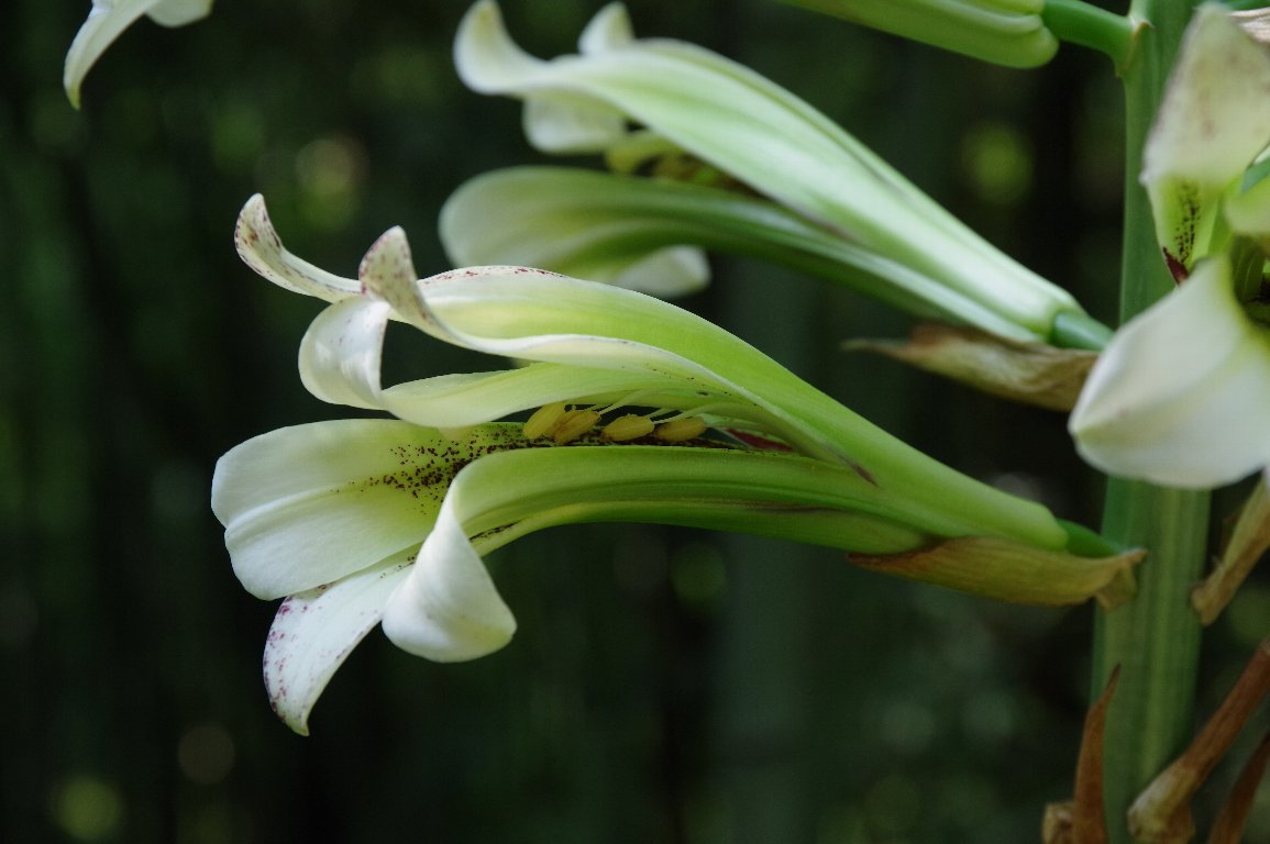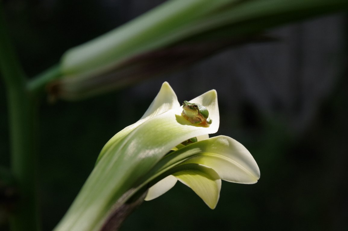 撮影雑記: 杉林のなかを行く山道のあちらこちらで、ウバユリが咲いていました。 なかでも、このウバユリは、目を見張る立派さでした。 ![]() トップのウバユリの全身の姿が、こちらです。 花が咲く頃は、葉が枯れて抜け落ちるので、葉が抜ける=歯が抜ける姥に引っ掛けて、ウバユリと名付けられた と言われますが、ところがどっこい、この株は、根もとの葉っぱがしっかり残っています。 ![]() 横から見た、花のアップ。 隙間からおしべが覗いており、老婆がニッと笑ってるようです。 もしかして、この花の姿から、ウバユリの名がついたのでは? ![]() 前から見た、花のアップ。 横からではよく見えなかった、めしべが見えます。 ![]() 花びらの上に、小さなアマガエルが、ちょこんと乗っていました。 今年、おたまじゃくしからカエルになったばかりでしょうか。 ![]() 時々、ハナバチがやってきて、忙しそうに花の中に出入りしていました。 |