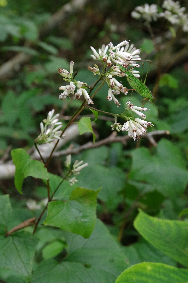 撮影雑記: この花は、大山山麓に咲いていました。 コウモリソウの仲間であることは、まちがいありませんが、コウモリソウとは葉っぱの形が、ちょっとちがいます。 近い仲間に、カニコウモリという、葉っぱがカニの甲羅のような形をした種類がありますが、それほどは葉っぱが 丸くありません。 帰ってから、調べたら、どちらでもなく、オオカニコウモリという種類でした。 そんな種類があったなんて、初めて、知りました。 ![]() 花は、かなり、地味です。 ![]() 花の上に、キリギリスに似た青い虫がいました。 アシグロツユムシと思われます。夏の頃は、ウバユリにこれの幼虫がいて、花をかじってました。 |