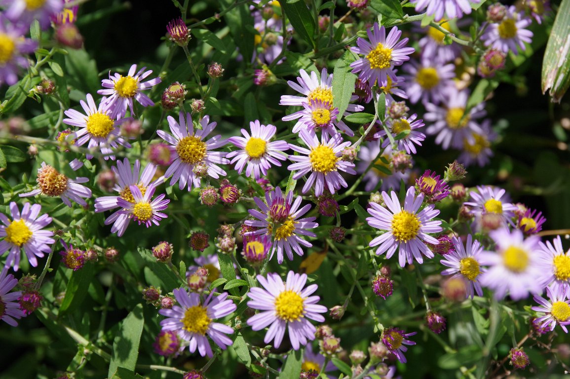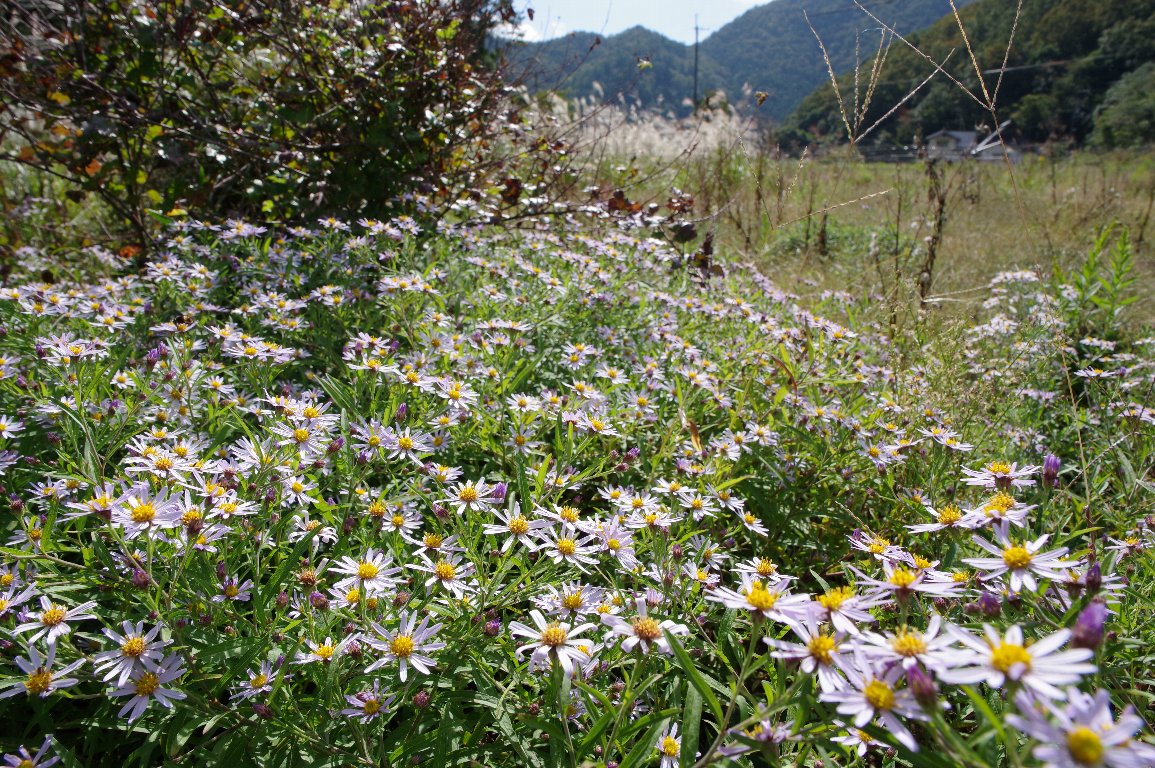 もっともふつうに見られる野菊のひとつ、ノコンギク。 秋になれば、道ばた、田んぼ、畑など、至る所で咲いているのを目にする。 時おり、やや濃いめの紫色の花があり、カメラを向けたくなる。 |