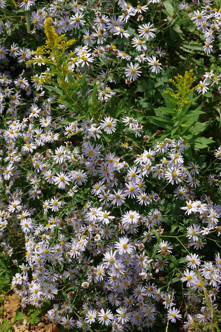 撮影雑記: 秋は、野菊の季節。 このノコンギクや、次に紹介するヨメナが、最もふつうに見られ、野菊の代表格の双璧と思います。 両者はよく似ていますが、慣れれば、すぐに見分けられます。 最大の違いは、種子に冠毛(ふわふわの綿毛)があるかないかで、あればノコンギク、なければヨメナです。 (すみません、今回アップした写真では、種子が写っていないので、冠毛のちがいはわかりません) ![]() 休耕田の脇に、たくさん咲いていました。 こちらは、大きな群落を作っていたノコンギク。 ![]() ノコンギクの花の色はうす紫色ですが、ほとんど白いものから(一番よく見ます)、わりと濃いものまで いろいろあります。 これは、トップと同じ、やや、色が濃いノコンギク。 ノコンギクは、野紺菊と書きます。もっと色が濃くて、園芸化されたのがコンギク(紺菊)です。 ![]() こちらは、色が薄いタイプの群落。 セイタカアワダチソウと一緒に咲いています。 もしかしたら、セイタカアワダチソウが衰退して、ノコンギクに入れ替わったのかもしれません。 |