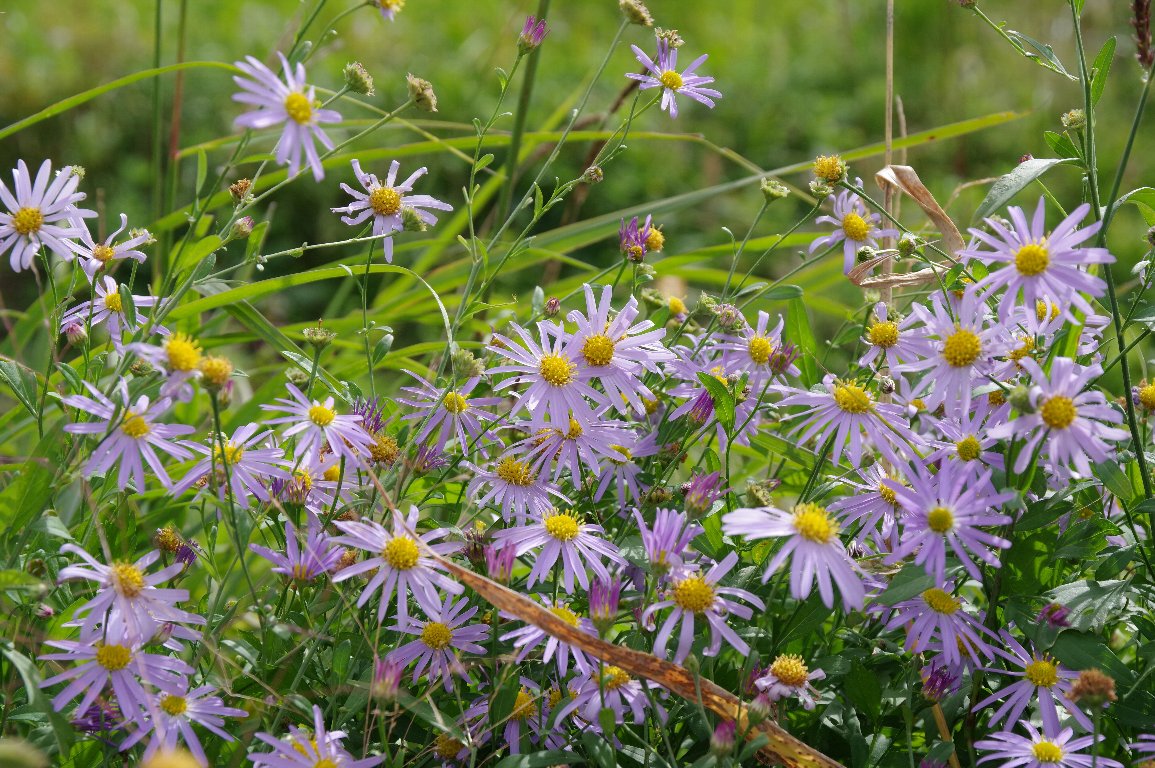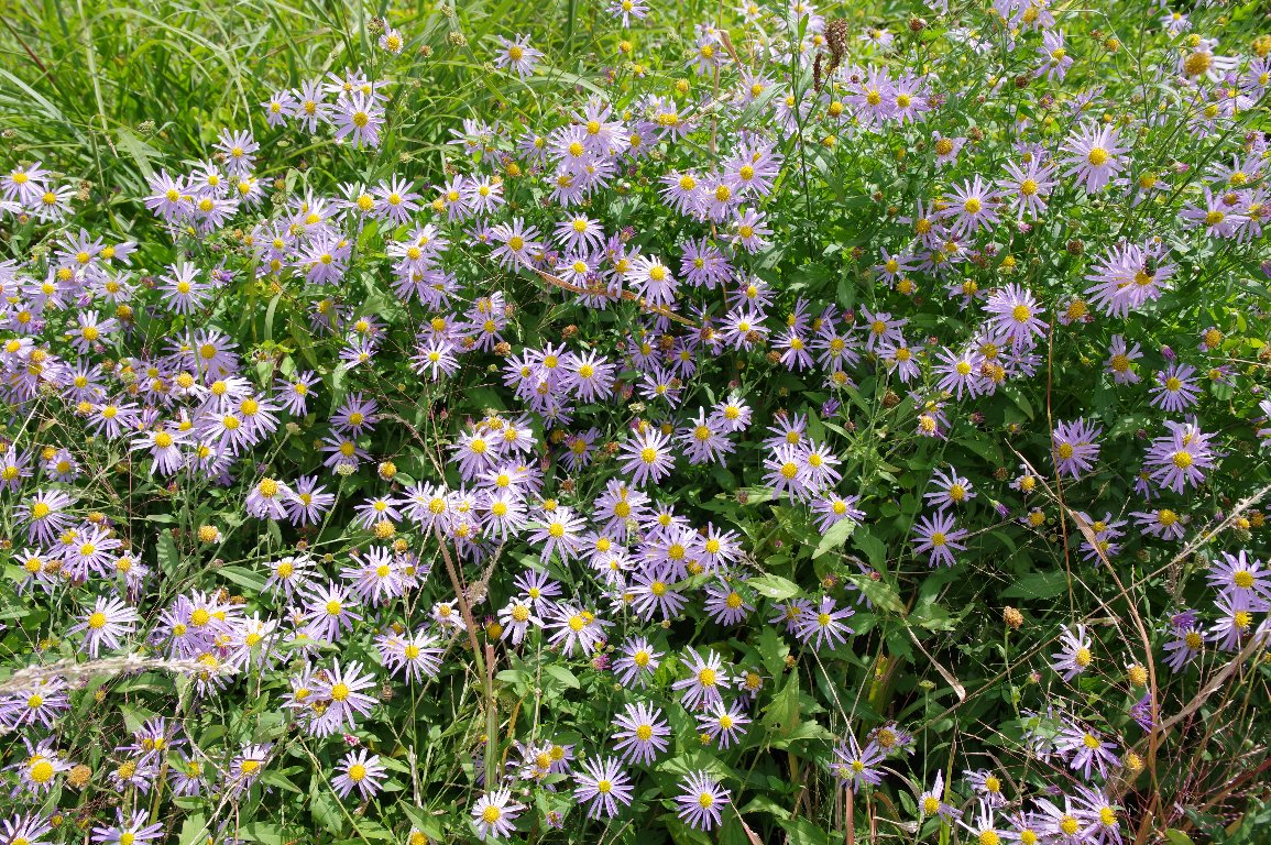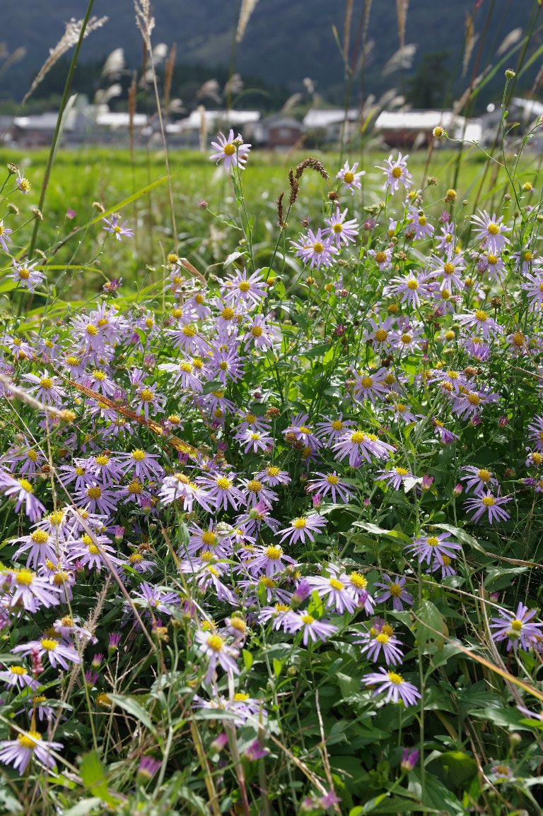 もっともふつうに見られる野菊のひとつ、ヨメナ。 水路の脇など、やや湿ったところに多い。 ここでは、田んぼの畦道に、所狭しと、密集して咲いていた。 |