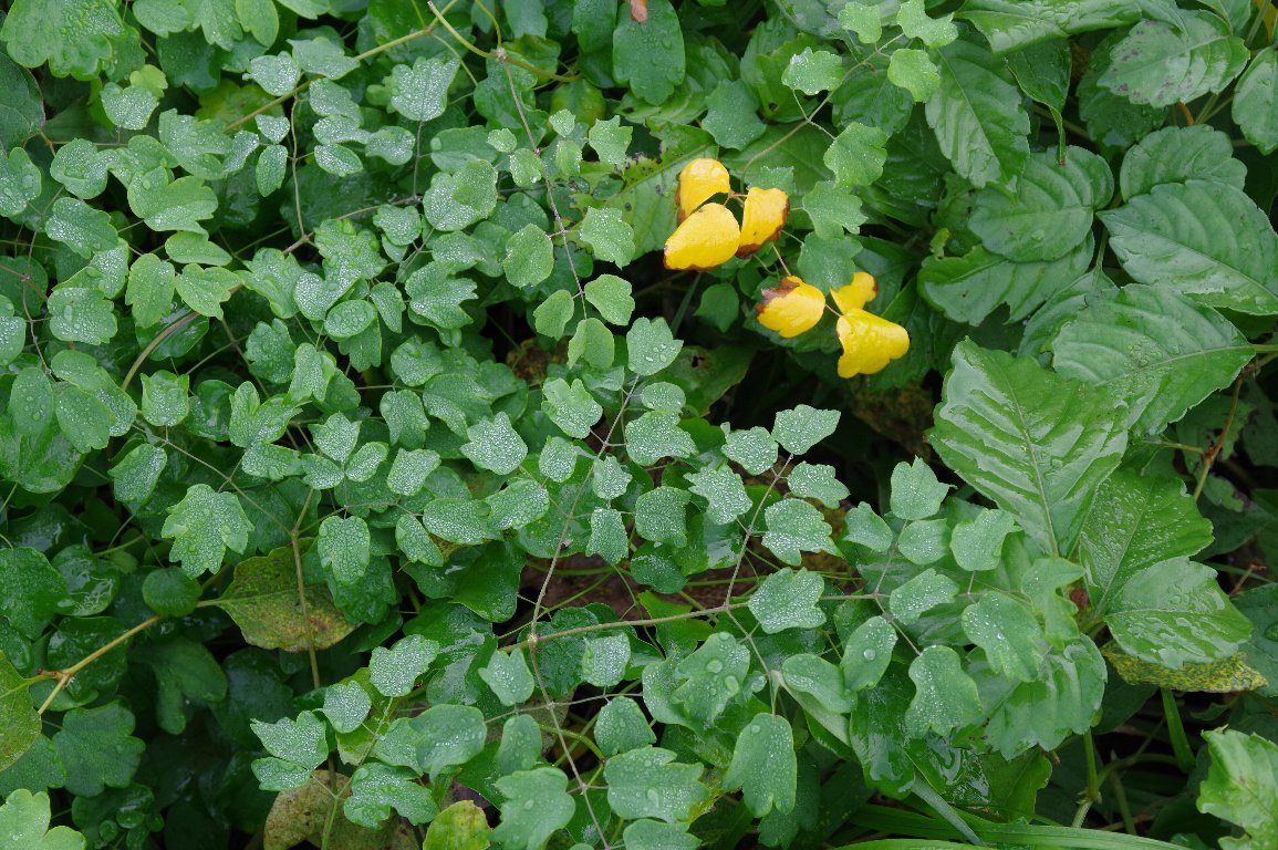朝露に濡れた、道ばたの草たちが織り成す模様が、おもしろい。 イタドリ、アキカラマツ、フジ。シュッと伸びるのは何だろう? 草刈り後に伸びたであろう葉っぱ。冬が訪れる前のわずかな間にも、光合成をして養分を蓄えるのだろう。 |