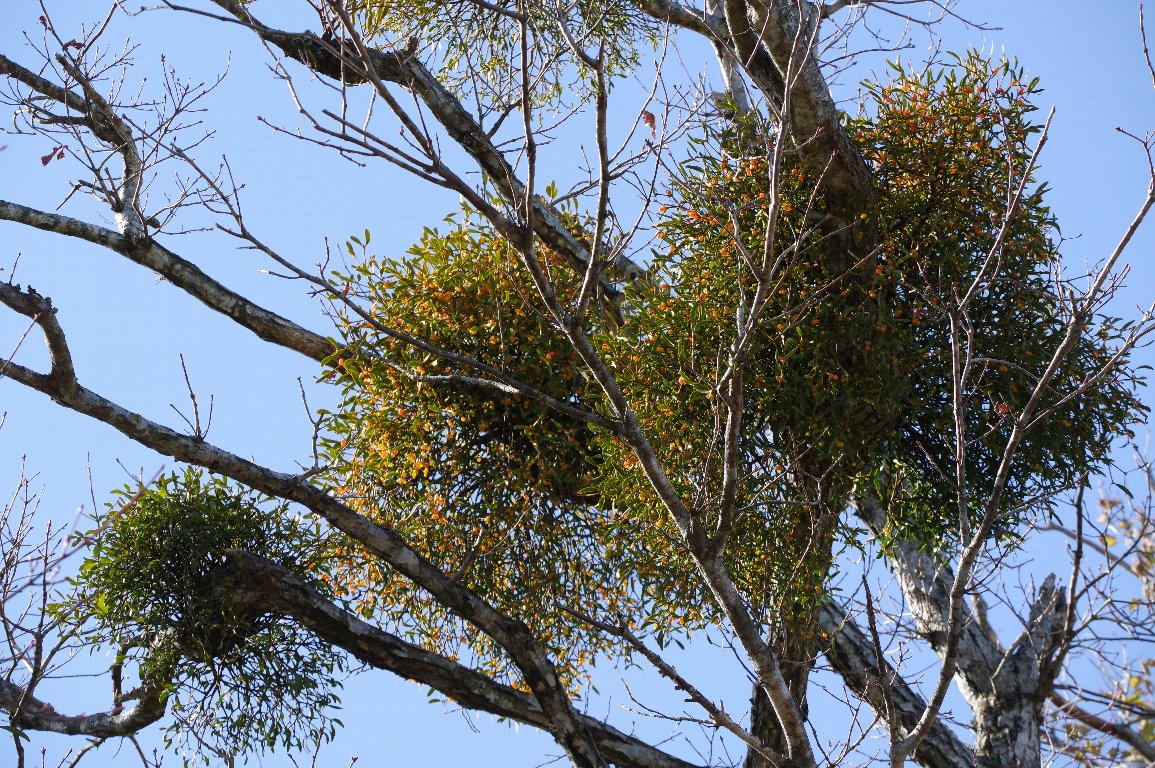 葉を落とした木の枝に、びっしりと緑の葉を茂らせ、橙色の実をいっぱいつけている塊がある。 木に寄生しているヤドリギだ。冬場は、宿主の木に栄養を与えているというのは、本当なのだろうか。 |