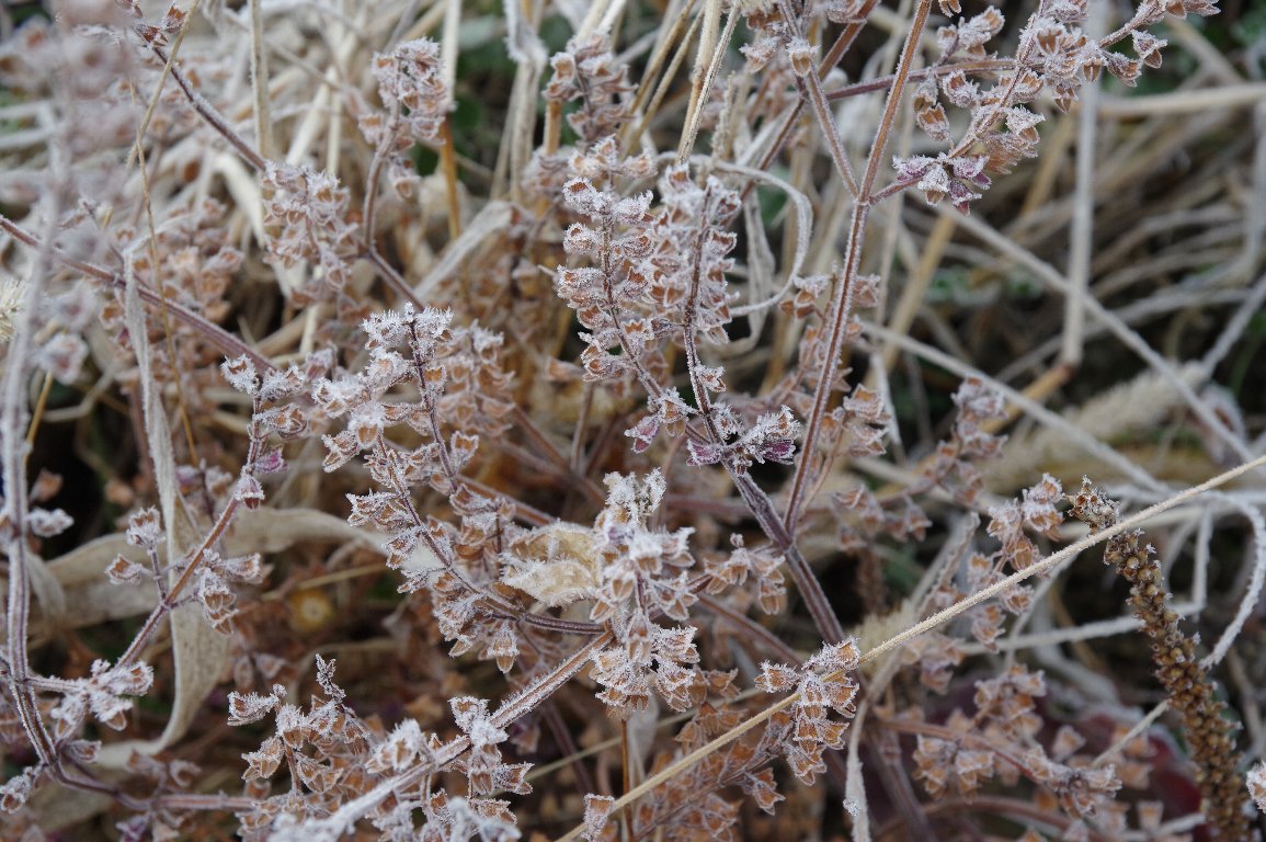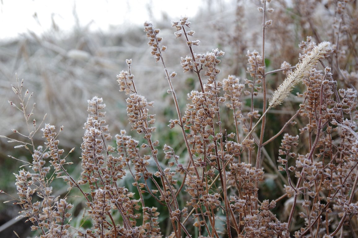 まだ、陽が当たらない田んぼの畦道は、霜でびっしり覆われている。 茶色い枯れ草は、ヤマハッカだ。 花の形の苞がそのまま残っていて、花の頃を偲ばせる。 |