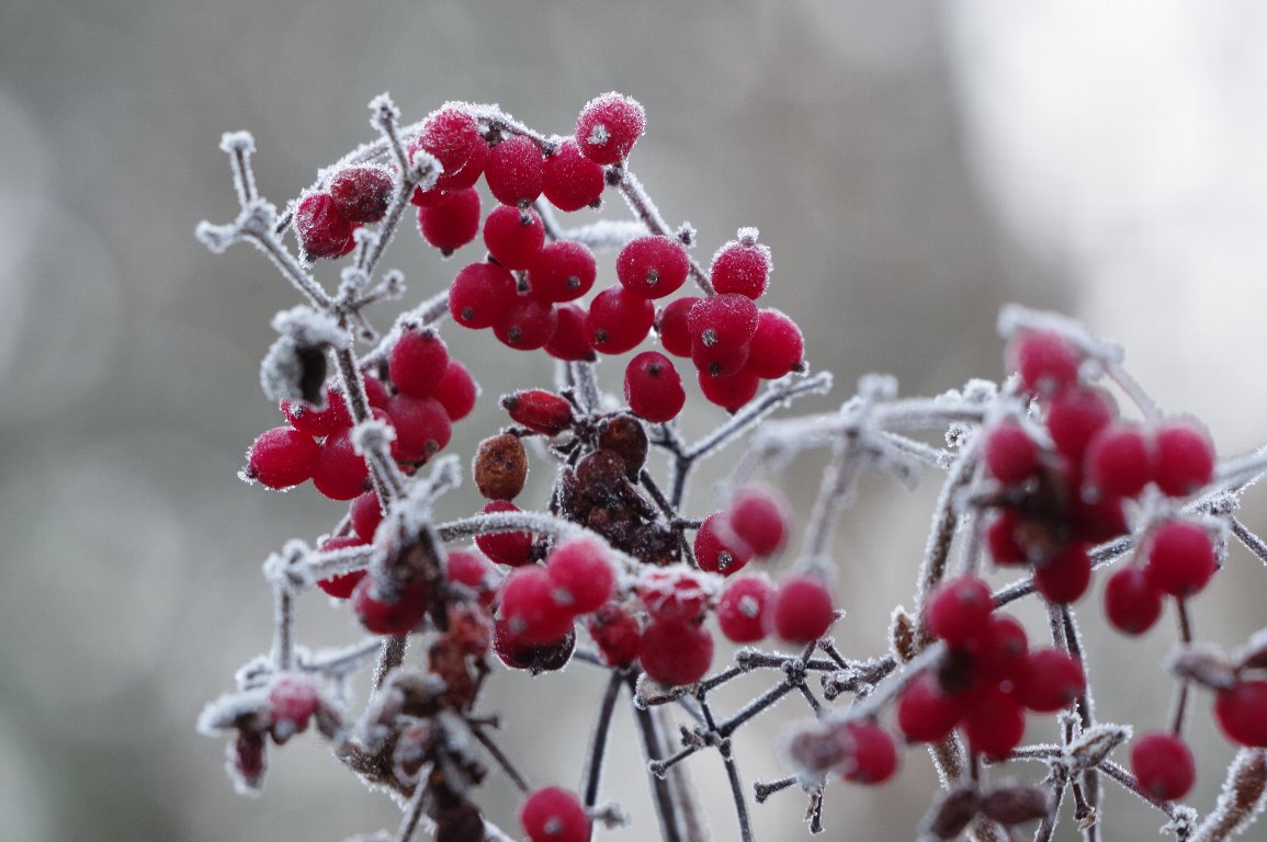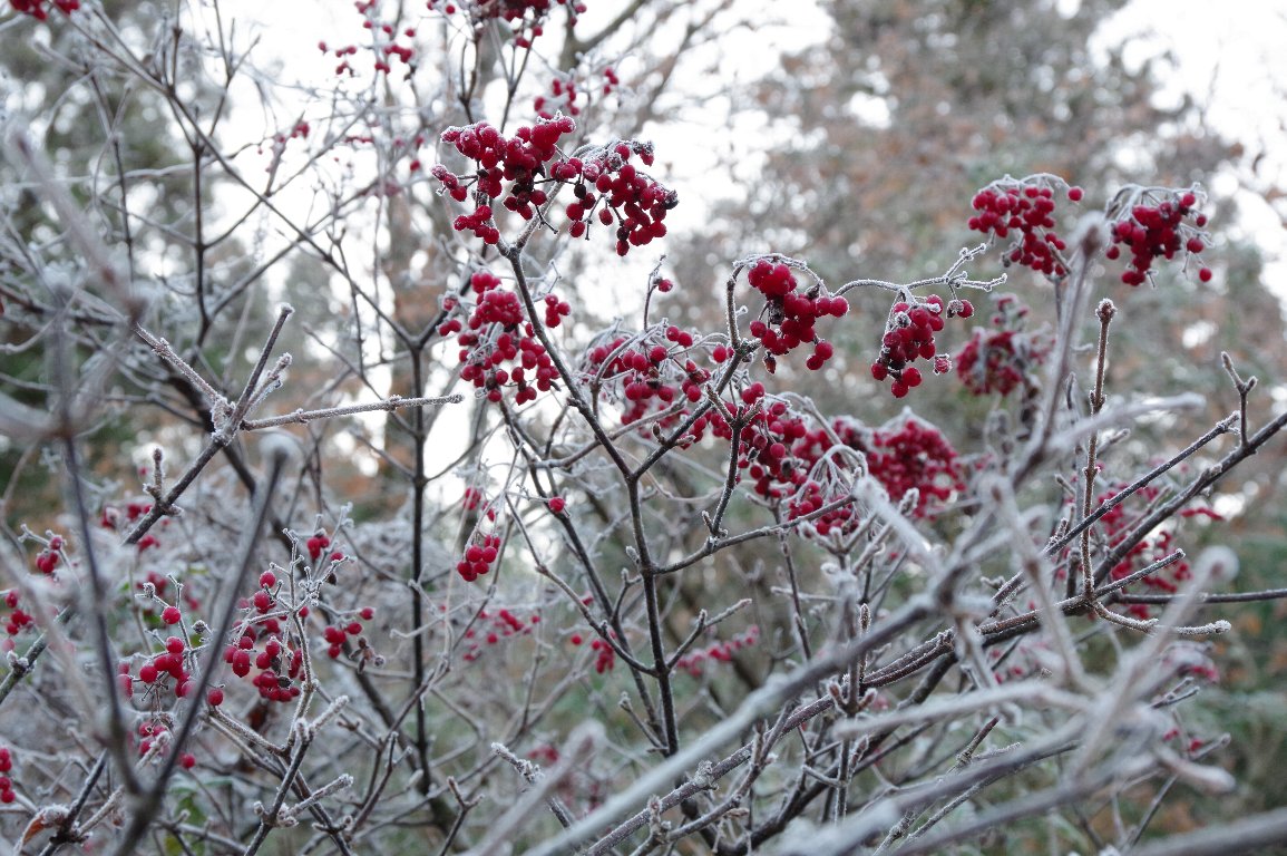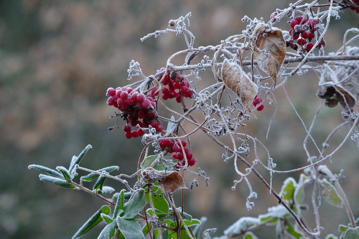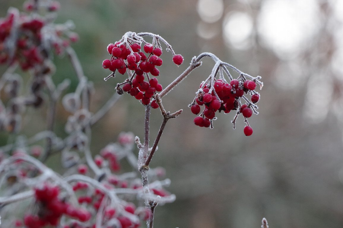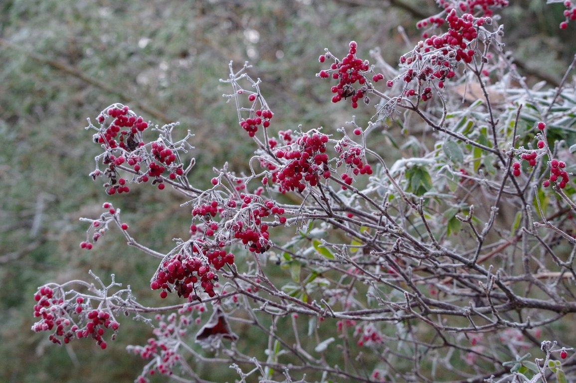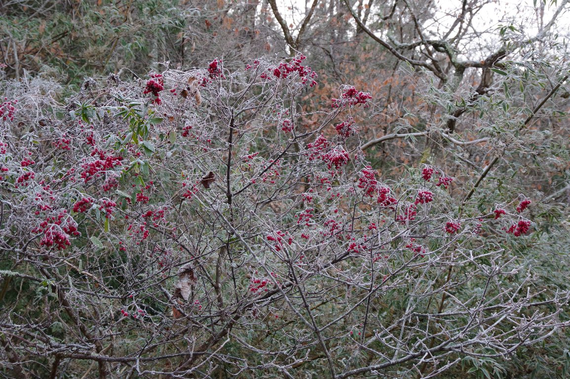 再び訪れたガマズミの実は、まるで、別の姿になっていた。 朝の静けさの中、全身、霜で覆われ、日が昇るのを待っていた。 |