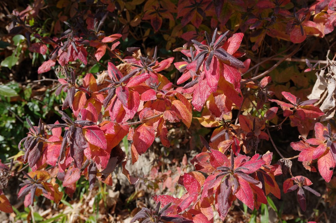 道端の藪で、燃えるような赤橙に色づいているのは、モチツツジ。 寒さで、全身、しもやけにでもなったかのような色だ。 |