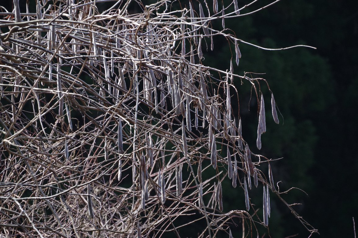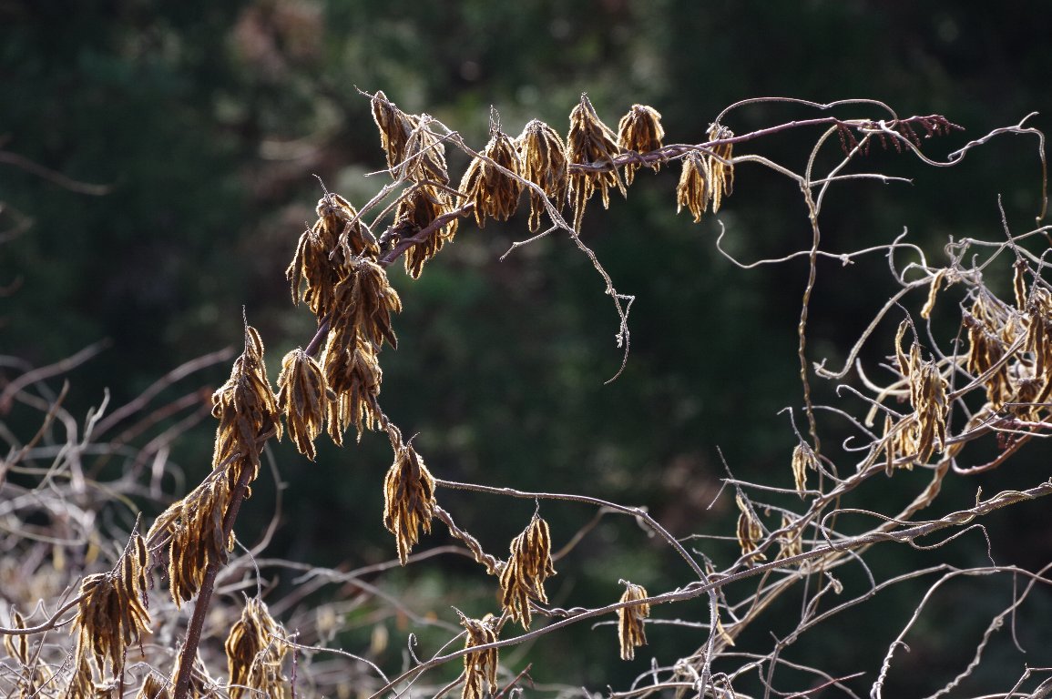 産毛が金色に輝くクズの実、ほんのり紫色のフジの実。 冬場に見かける、マメ科の実のさやは、印象的だ。 その両者が、同じ枝に、寄り添うようにぶら下がっていた。 |