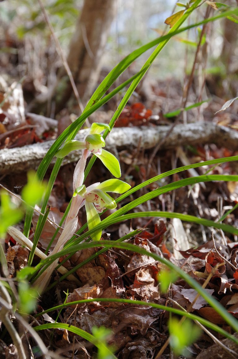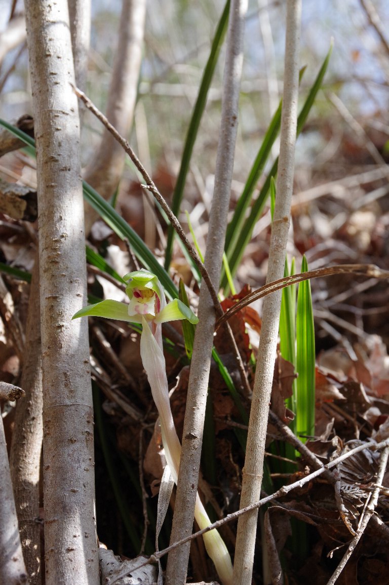 雑木林の落ち葉をかき分けるようにして、シュンランが咲いていた。 まだ、空気は少し肌寒いが、強くなってきた陽射しを逃すまいとしているようだ。 |