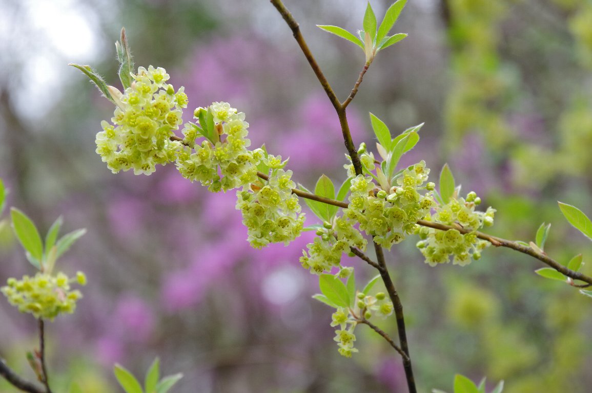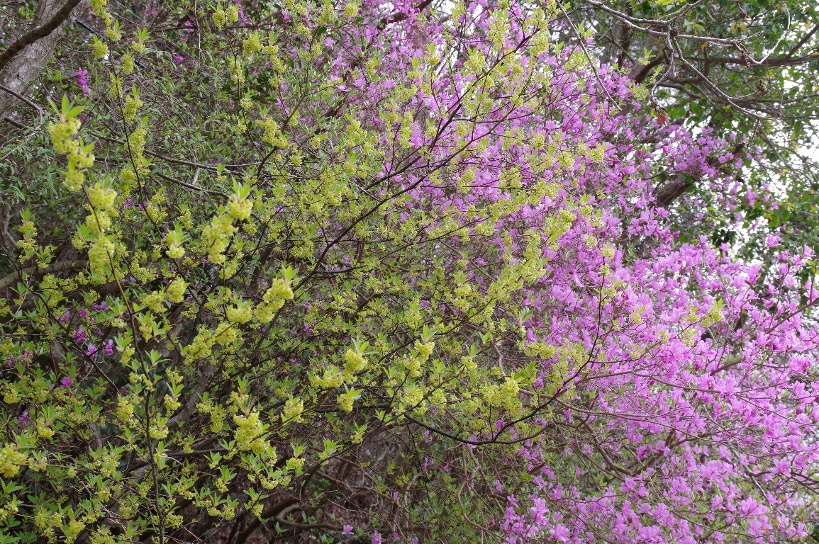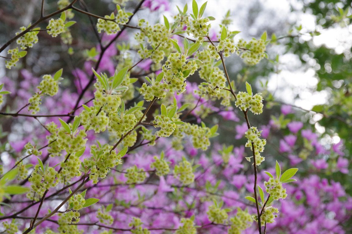 あでやかなピンクのコバノミツバツツジをバックに、クロモジが、やや地味目な薄黄色の細かい花を枝先に