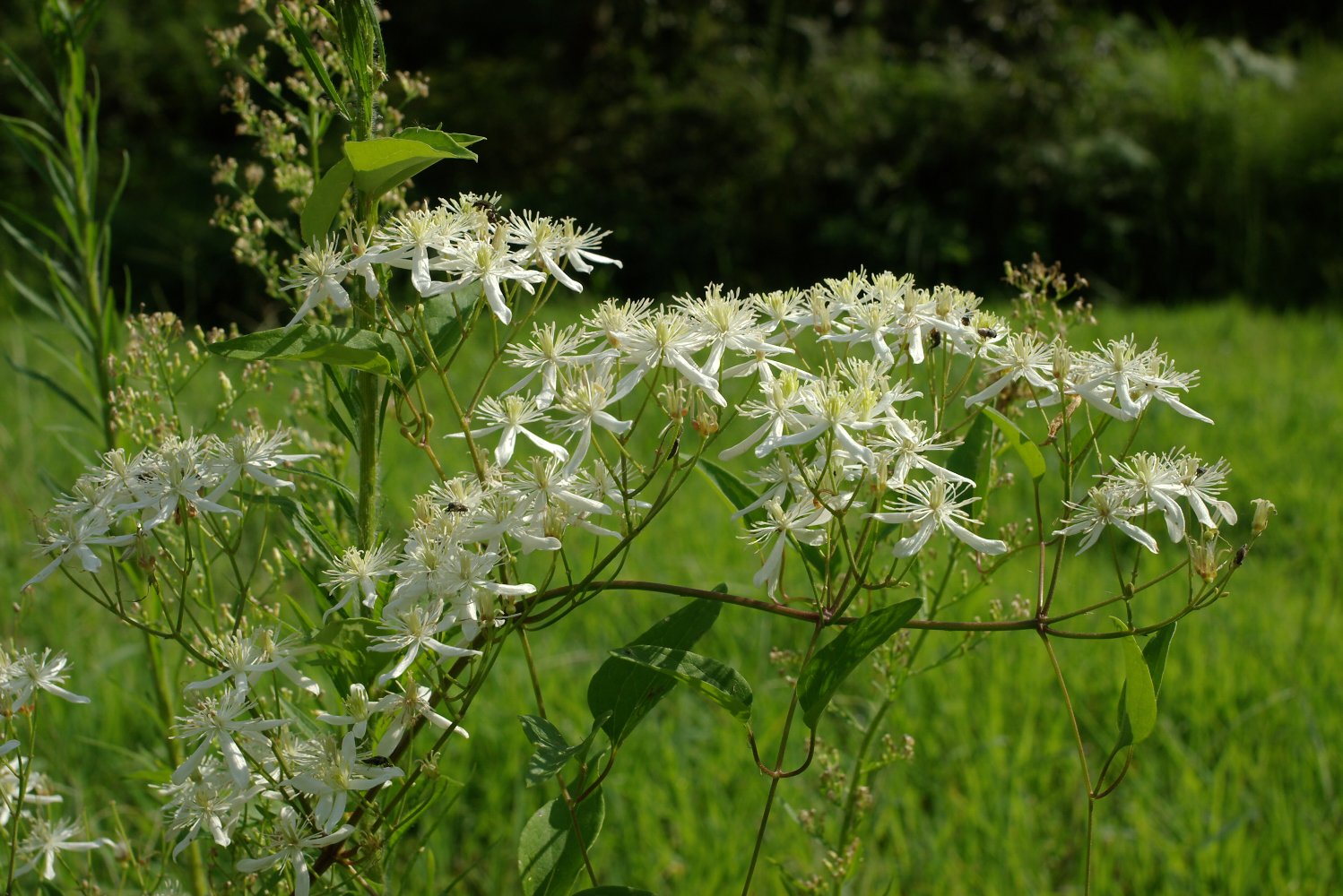 いろんな所に絡みつくセンニンソウですが、 支柱であつらえたかのように、他の草にもたれかかって咲いていました。 |