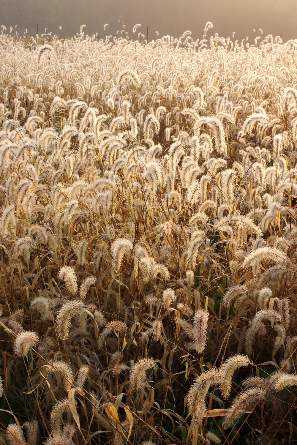 撮影雑感: 晩秋になると、早朝、霜の降りた景色を撮りに、出かけるようになります。 この日も、霜狙いだったのですが、いまいち冷え込みが足らなかったようで、露は降りている ものの、白くなっている景色はなさそうでした。 どうしたものか、と思って車を走らせていると、なにげにいつも通り過ぎている道端のわきで、 一面に茂っているエノコログサが、全身に朝露をまとい、昇り始めた朝日にきらきら輝いているでは ありませんか。 朝の景色は、一瞬です。 刻一刻と変わっていきます。どうしようかと迷っている暇はありません。 ファインダーの中できらきら輝くエノコログサに感動しながら、何枚もシャッターを切りました。 日が昇り、露が乾けば、ただの、道端の雑草が生えている景色に過ぎないのに、こんなに感動的な 景色に出会えるから、飽きもせず、写真を撮りに出かけるんです。 残念なことに、この、エノコログサが茂っていた小さな畑(休耕畑?)は、道路の拡張でなくなって しまいました。 |