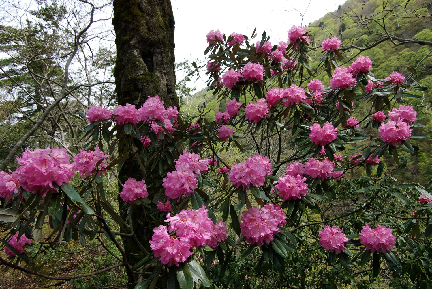 あえぎあえぎ急な尾根道を登ってゆくと、右にも左にも、溢れんばかりのシャクナゲの花が! 今まで見たことのない光景に大興奮でした。 |