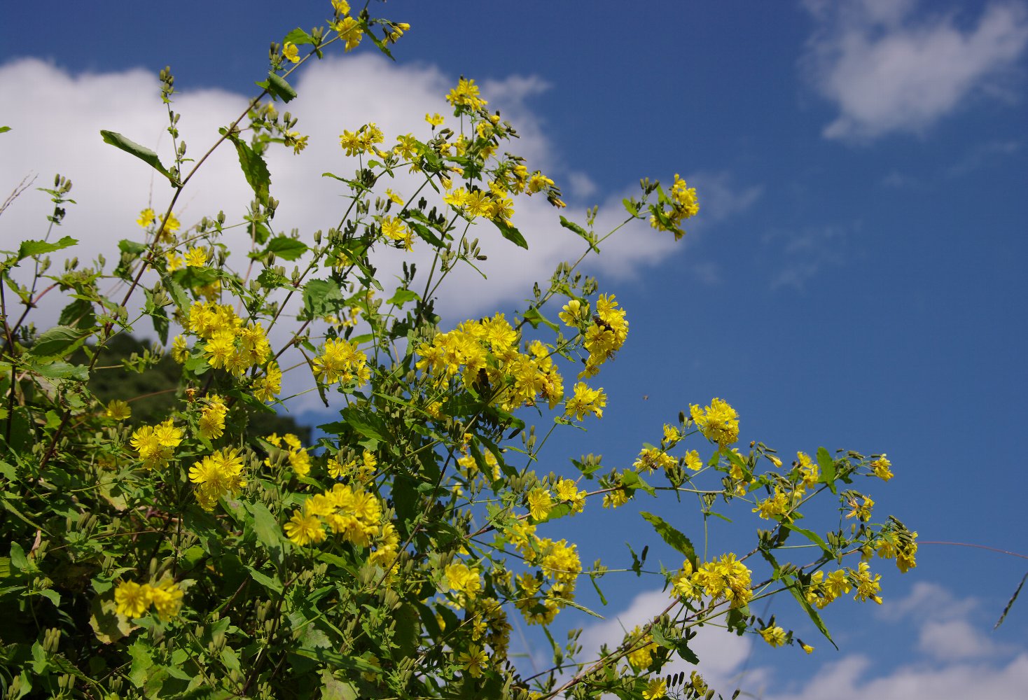 収穫の終わった棚田に咲くヤクシソウ。 秋晴れの高空に、黄色い花が映える。 |