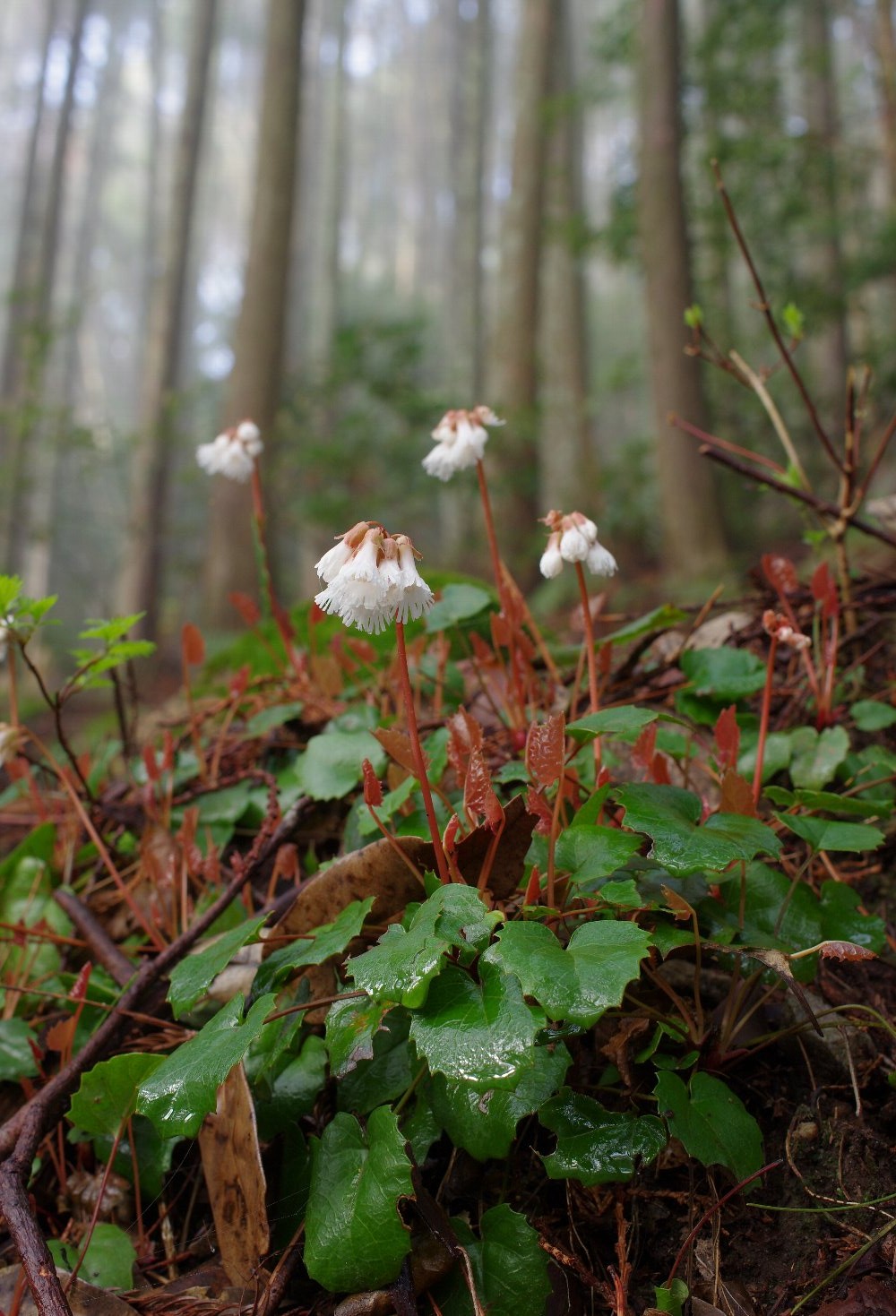 4月半ばの故郷には、いつも帰省するGWとはちがう花の景色がありました。 山の林の下に咲く、ヤマイワカガミの清楚な白い花 |