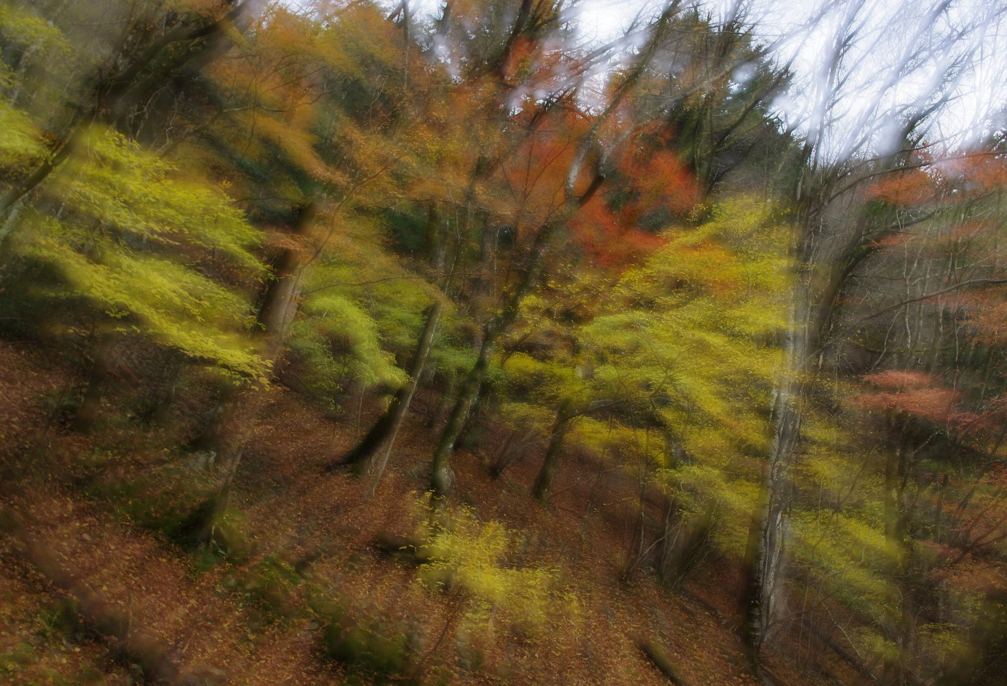 撮影雑感: 自由作品2作目は、赤西渓谷の紅葉の写真です。 紅葉と言っても、ちょっと時期が遅く、そのうえ、前日の強雨のため、かなり、散ってしまっていました。 普通に撮っても、何ともさえない感じだったので、夏に多重露出して撮ったのを思い出し、同じように、 いや、さらに悪乗りして、遊んでみたものです。 カメラを三脚にセットして、ピントをずらしながら、5カットほどを多重露出で重ねてみました。すると…。 全体に、ふわっとした仕上がりになると思ったのですが、予想に反して、真ん中から外側に向かって、 広がってゆくような写真になりました。 理屈はよくわかりませんが、ピントのボケは、外側に向かって広がるのでしょうね。 パッとしない紅葉じゃなく、きれいな紅葉だったら、きっと、こんな写真を撮ろうと思わなかったでしょう。 怪我の功名でした。 |