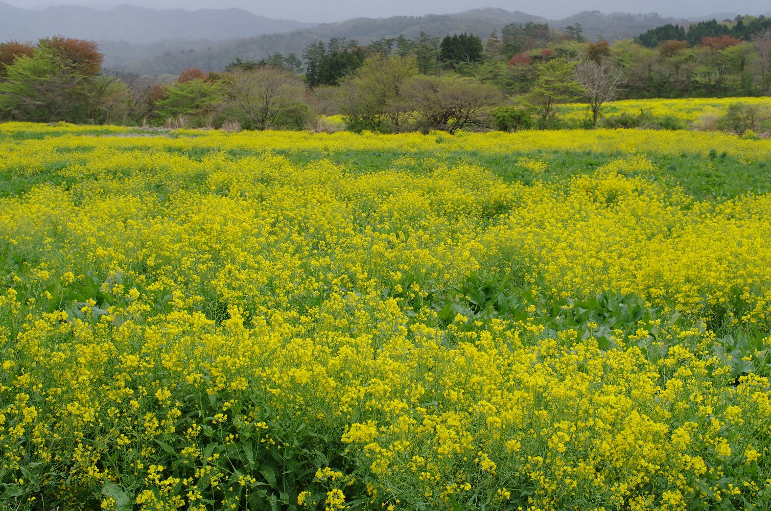 | 菜の花畑広がる春の山麓。 | ||||||||||||||||||||||