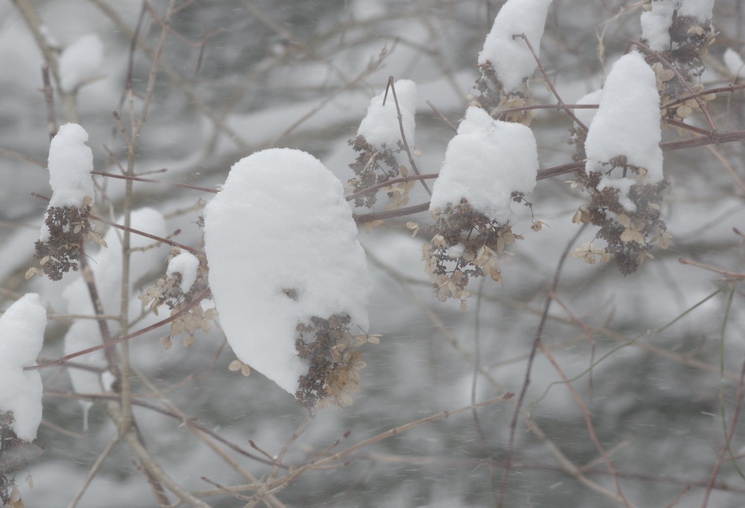 撮影雑感: 豊楽会から取った、第10回の「豊」、第11回の「楽」、第12回の「会」と続けた作品テーマも、 一巡りしました。 第13回は、ひとりずつ、1枚のボードに自由に作品を展示するという案も出ましたが、結局、 自由作品3点または4点、ただし、作品は一つのテーマでまとめる、ということに落ち着きました。 さて、どうしようか。 とりあえず、5月上旬に撮った、ジャケツイバラの写真が気に入っていたので、これは出したいと思いました。 2月上旬に撮った、ノリウツギの枯れ花に雪が丸く積もった写真もいいな。 11月上旬に、砥峰高原で、多重露出をしたススキも面白い。 と、ここで、気づきました。 ノリウツギは立春、ジャケツイバラは立夏、ススキは立冬のころに撮っています。 あとは、立秋だけ。8月上旬ごろは、ちょうど、夏の日本海に行って、トウテイランを撮っていました。 これで決まり! 立春、立夏、立秋、立冬の頃に撮った花4作品。テーマもばっちり。 1作品目は、立春の頃。 2月上旬は、一年で最も寒い時期です。 寒さが極まったので、ここからは春に向かう、「春の気が立つ」ということで、立春なのです。 枕詞のように言われる「春とは名ばかりで」というのは、誤りです。 この日、旧美山村のかやぶきの里は、すっぽり雪に覆われていました。 さらに、山の奥に入ると、木々に積もった雪が、いろんな表情を見せてくれます。 ノリウツギの枯れ花に、山高帽のように乗っかった雪が、とても、ユニークで面白い姿でした。 何枚も撮っているうちに、急に雪が舞いだして、風も吹いて、こんな、白っぽい写真になってしまいました。 でも、このカットが、いちばん、おもしろく撮れた一枚でした。 |