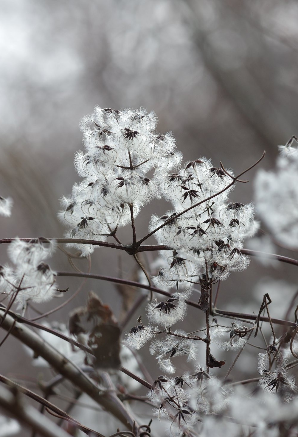 撮影雑感: 2つ目は、ボタンヅルの、ふわふわの白い実です。 綿毛をまとったボタンヅルの実は、色の乏しくなった冬場においては、けっこう目立つ存在です。 この時も、林道わきの枝に絡まる白い実が、すぐに、目に飛び込んできました。 枯れ枝に絡まる様子は、まるで、無造作に掛けられたレースのようです( 花の二十四節気3:冬至:ボタンヅル)。 望遠レンズで、ふわふわの綿毛を、アップで覗いてみました。 この日は、朝は晴れていたのですが、徐々に薄い雲が広がり始めて、ボタンヅルの写真を撮って いる頃は、鈍い光が当たっている状態でした。 そんな中で、ボタンヅルは、いぶし銀のように輝いていました。 色のない背景に、白く輝く、ボタンヅルの実。無彩色の、自然の芸術でした。 ※この綿毛は、当初、センニンソウと紹介していましたが、正しくはボタンヅルと思われます。 |