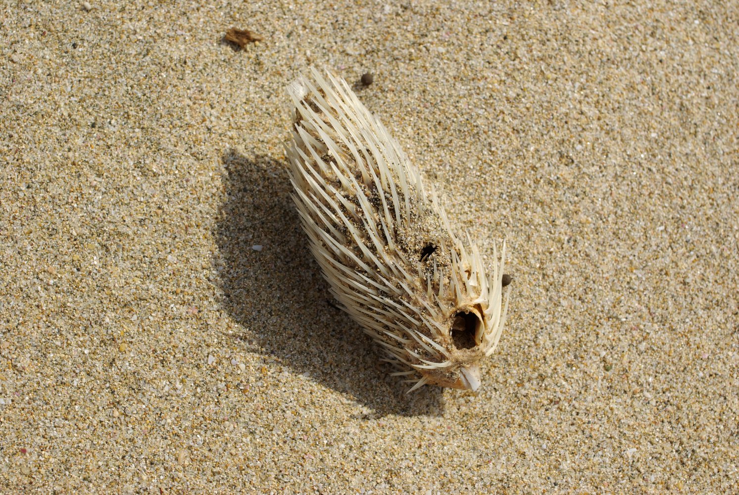 浜辺に打ち上げられていたのは、骸骨化したハリセンボン。 ユニークな姿に、思わずシャッターを切ったが、後から見ると、その表情は、 恨めしそうにも見えました。 |