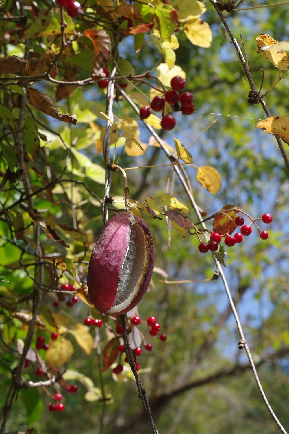 アケビの実が生っていました。 子供の頃は、学校の帰り道で、アケビの実を取って食べたものです。 |