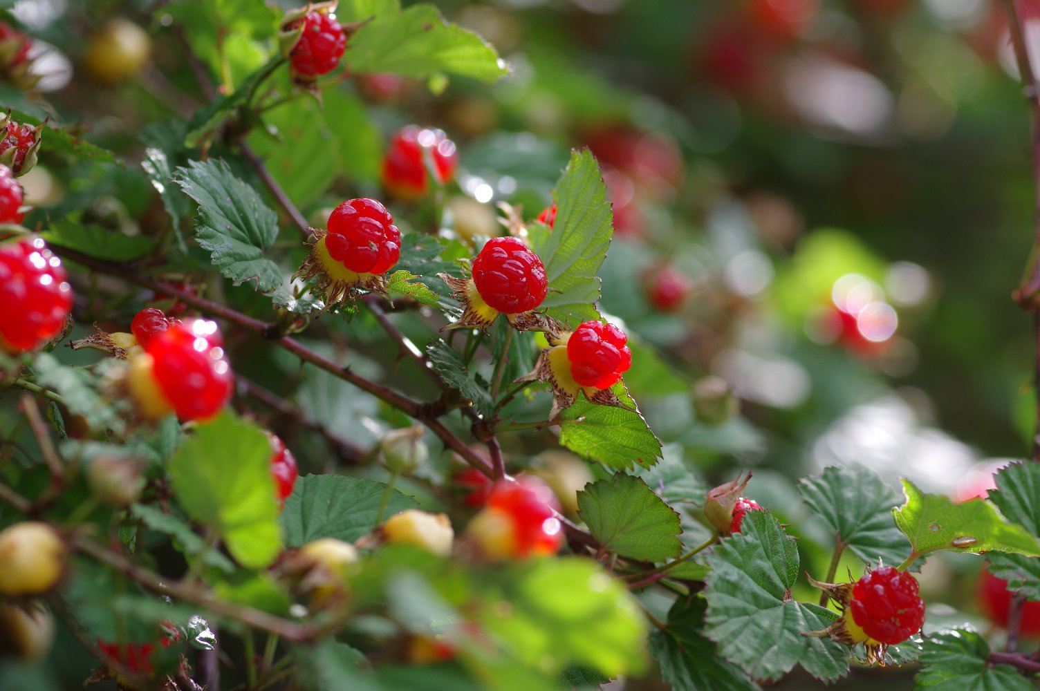 山道に、わんさかニガイチゴが生っていました。 真っ赤ないちごの実に、薄雲越しの弱い日差しが当たって、とてもきれいです。 ルビーのような輝きに思えました。 |