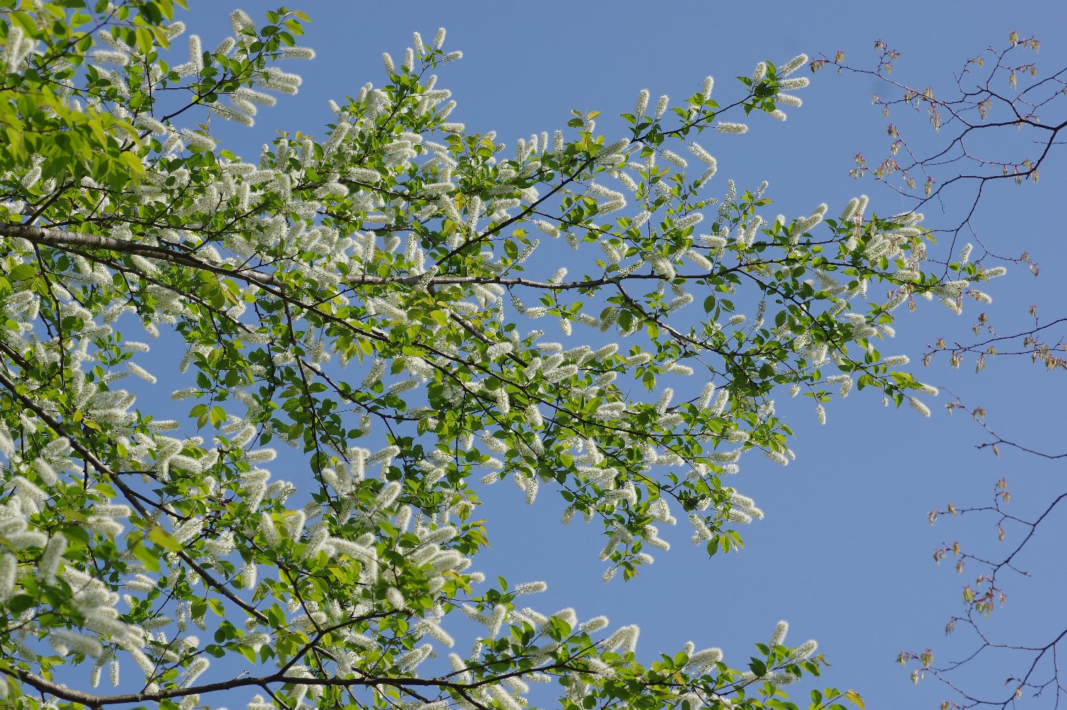 この年は、ウワミズザクラの大当たり年でした。 あっちの山、こっちの山で、ブラシのような花をにぎやかに咲かせていました。 青空をバックに広がる花は、春が来たうれしさを全身で表しているようでした。 |