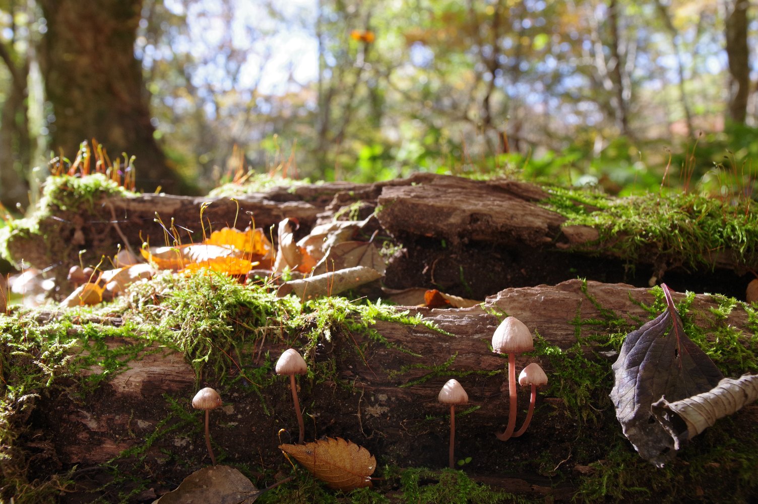 室の内に降りると、しばらくは、うっそうとした林の下を進みます。 見上げれば、赤、黄、橙に色づいた木々の紅葉が、日の光を受けて重なっています。 ふと、足元を見やると、朽ち木の下か小さなキノコが! キノコとコケと落ち葉の、かわいい風景が撮れました。 |