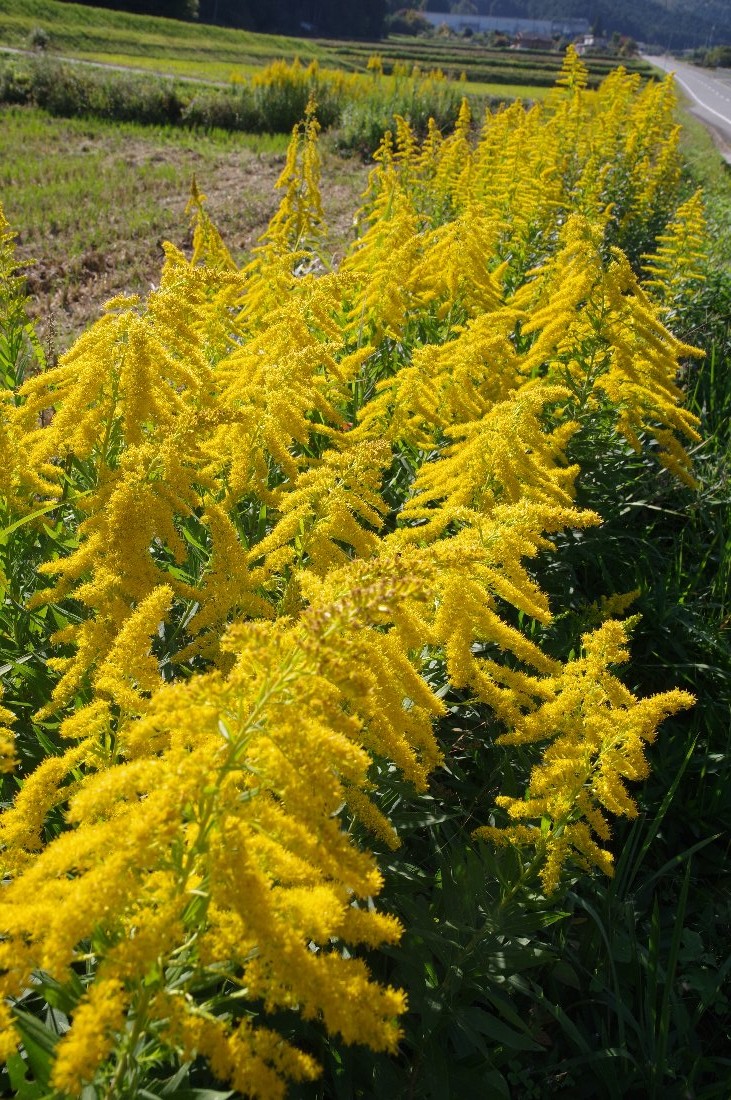 道ばたに伸びる、黄色い絨毯、花のみち。