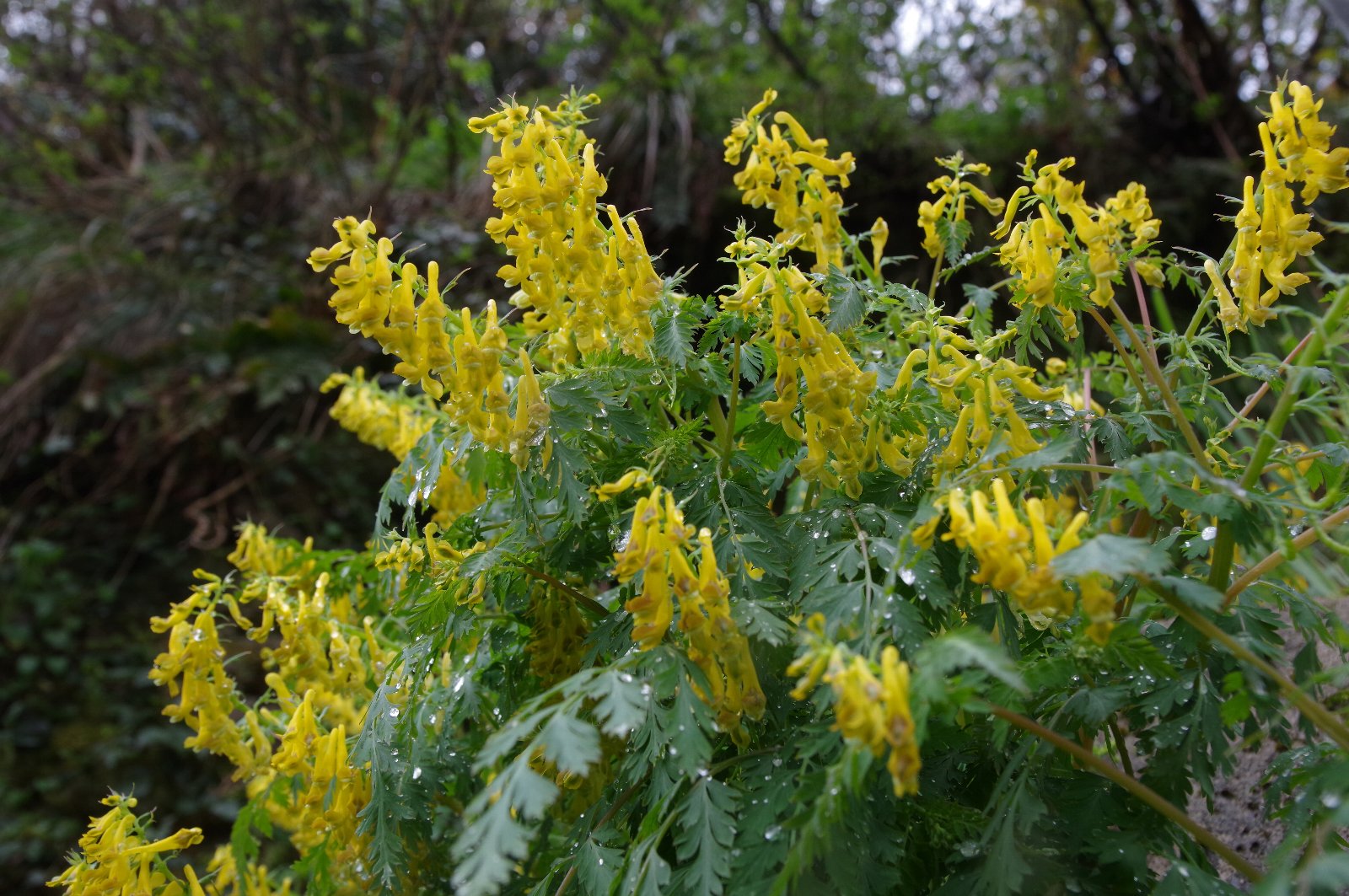 道端の、砂防用コンクリート壁の横で、大きなミヤマキケマンが、満開の花を咲かせていました。 まだ、雨があがって間もないのでしょう、水滴を全身にまとっていました。 |