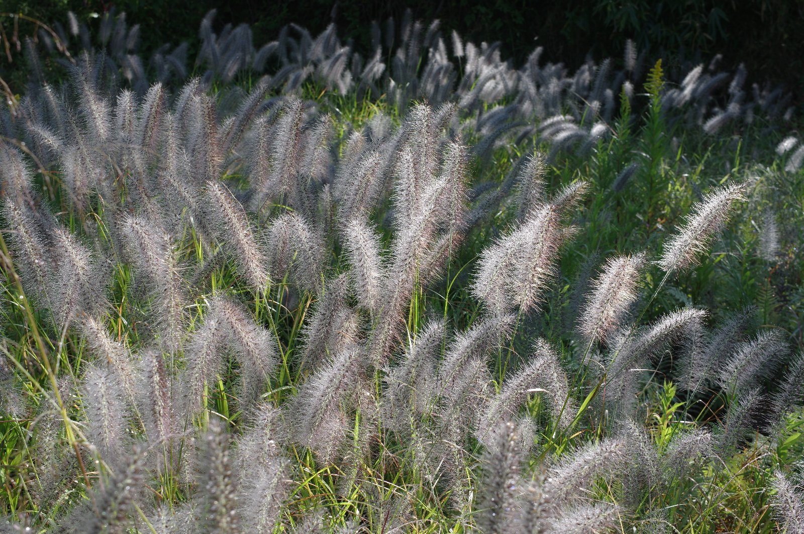 黒々としたチカラシバの群落も、露が降りて朝日が注ぐと一変します。 銀色に輝くその姿は、しぶきを上げた波頭が広がっているようでした。 |