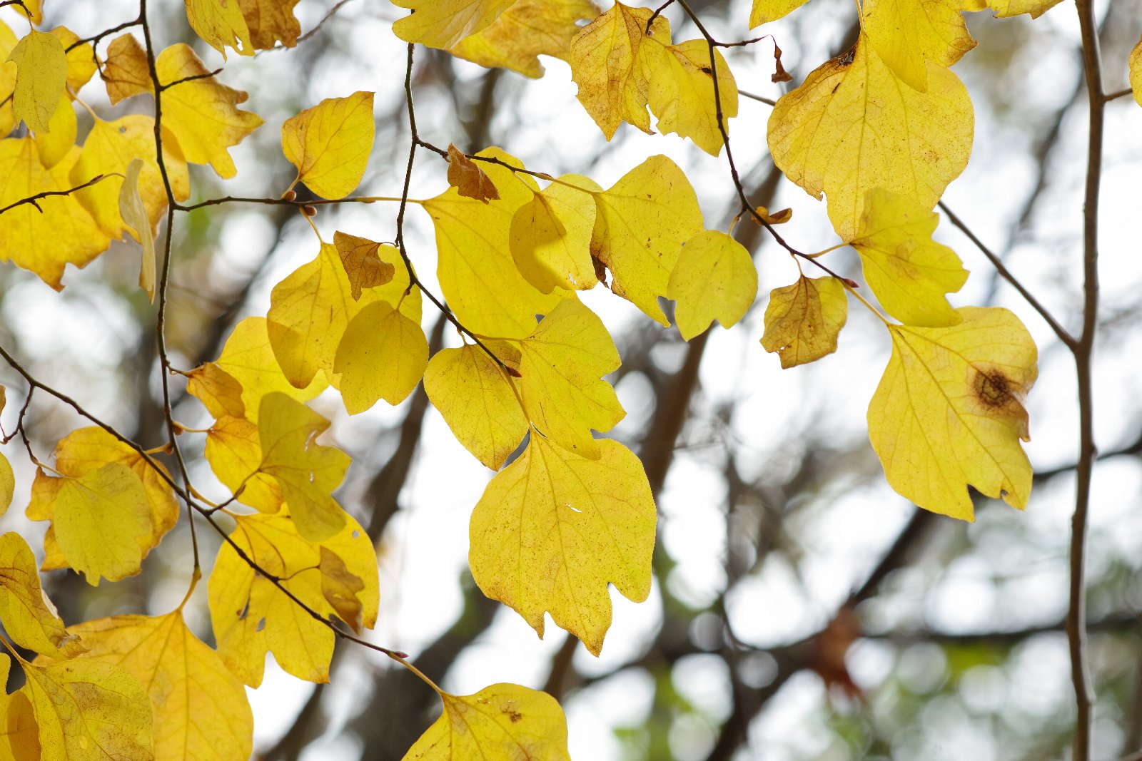 ダンコウバイのユニークな葉っぱの黄葉を見るたびに、先割れスプーンを思い出します。 と言っても、今の若い人たちは、わからないでしょうね。給食で使ったんですよ。 |