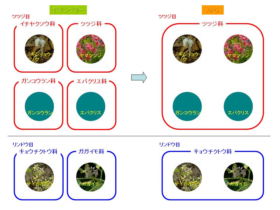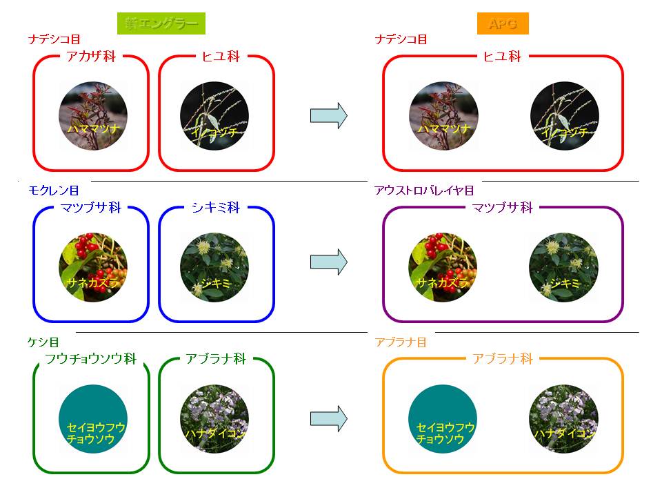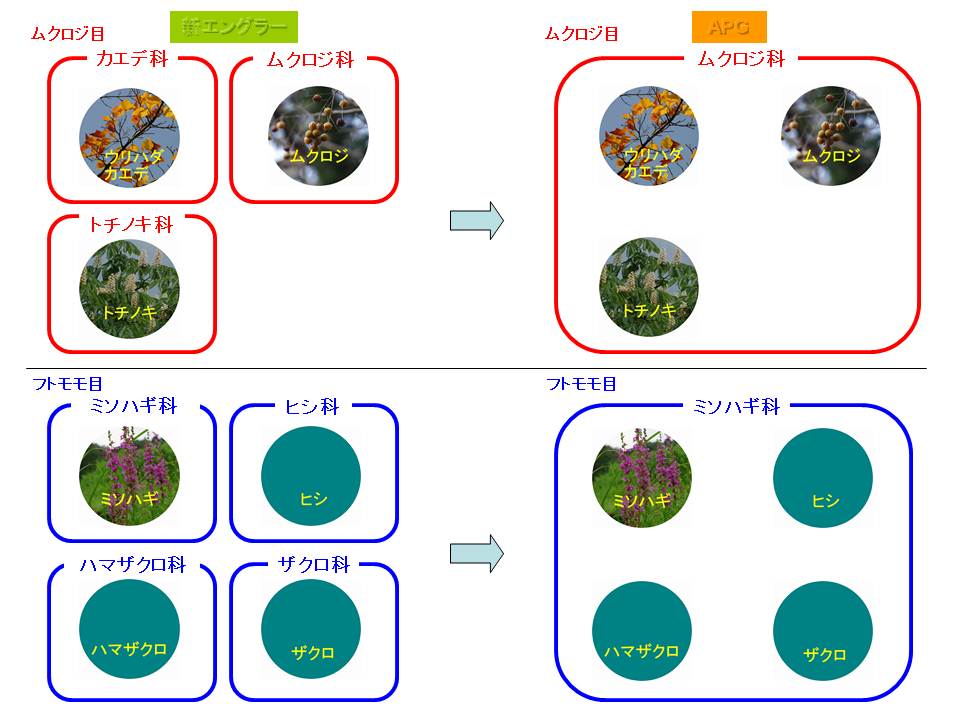 2つ以上の科が、1つに統合されるケースの紹介です。 これも、感覚的には、そんなにむつかしくは無いと思います。 どのケースも、もともと、よく似た科どうしが1つにまとまるだけなので、あまり違和感も 感じないのではないでしょうか。 ![]() ![]() ![]() ただ、統合されるということは、科の名前も1つになるということなので、幾つかの 科の名前が消滅することになります。 例えば、 アカザ科+ヒユ科=ヒユ科となり、アカザ科が消滅、 マツブサ科+シキミ科=マツブサ科となり、シキミ科が消滅、 キョウチクトウ科+ガガイモ科=キョウチクトウ科となり、ガガイモ科が消滅、 となります。 統合されて、消える科名の中でいちばん衝撃的なのは、 カエデ科+ムクロジ科+トチノキ科=ムクロジ科でしょうか。 なんと、カエデ科とトチノキ科が無くなってしまいます。特に、カエデというのは、 日本ではなじみのある名称で、それが科の名前でなくなってしまうのは、ちょっと、 驚きでした。 イチヤクソウ科+ツツジ科+ガンコウラン科+α=ツツジ科も大きな合併ですが、 私は、なるほどと思いました。 次からは、いよいよ、科が組み変わるケースの紹介です。 だんだん複雑になってきますよ。 |